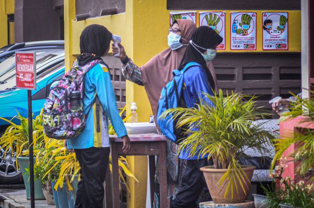 Tinjauan pengamal media di luar pekarangan pintu masuk utama mendapati pengawal keselamatan dan guru bertugas mencatatkan suhu murid-murid yang tiba di hadapan pagar sekolah kira-kira pukul 7 pagi.