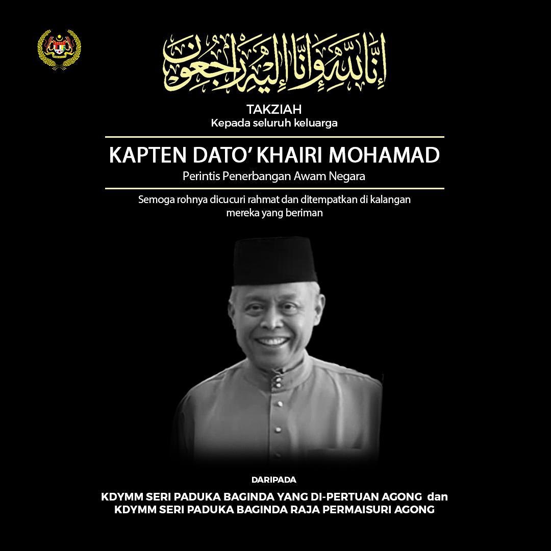 KUALA LUMPUR : Seri Paduka Baginda Yang di-Pertuan Agong menzahirkan ucapan takziah kepada isteri dan seluruh keluarga perintis penerbangan awam negara, Kapten Datuk Khairi Mohamad yang telah kembali ke Rahmatullah pada hari Khamis lalu.