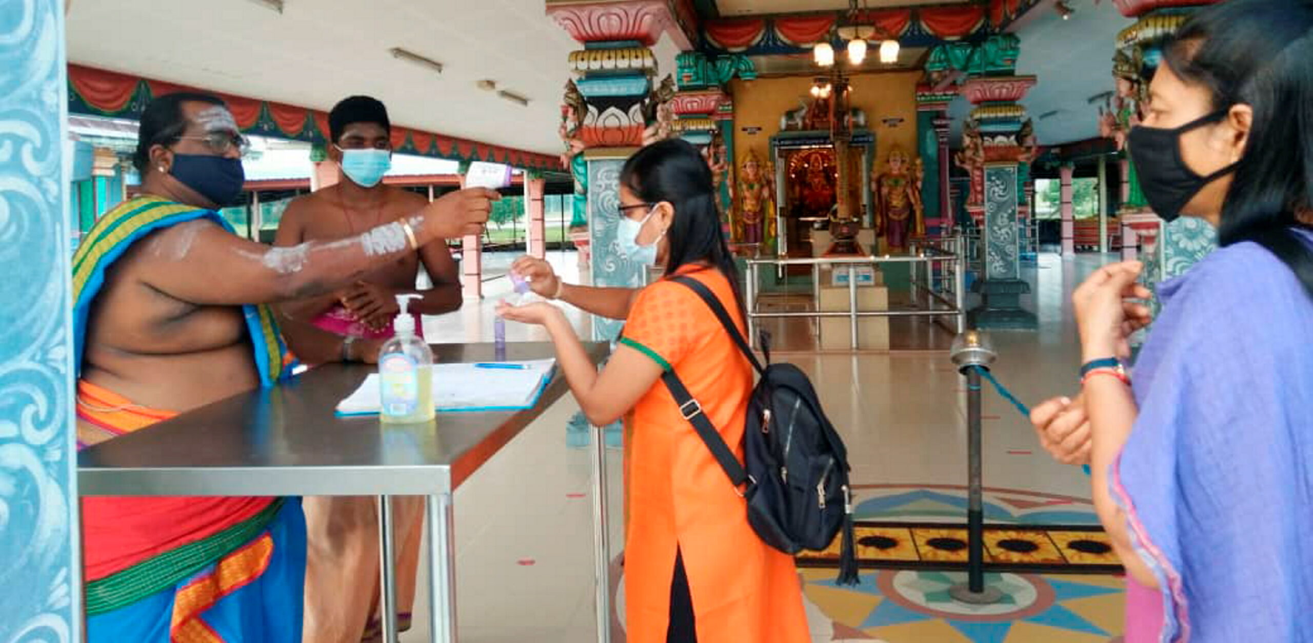 Orang ramai yang mahu memasuki kuil menjalani pemeriksaan suhu, memakai pelitup muka dan menjaga penjarakan sosial.