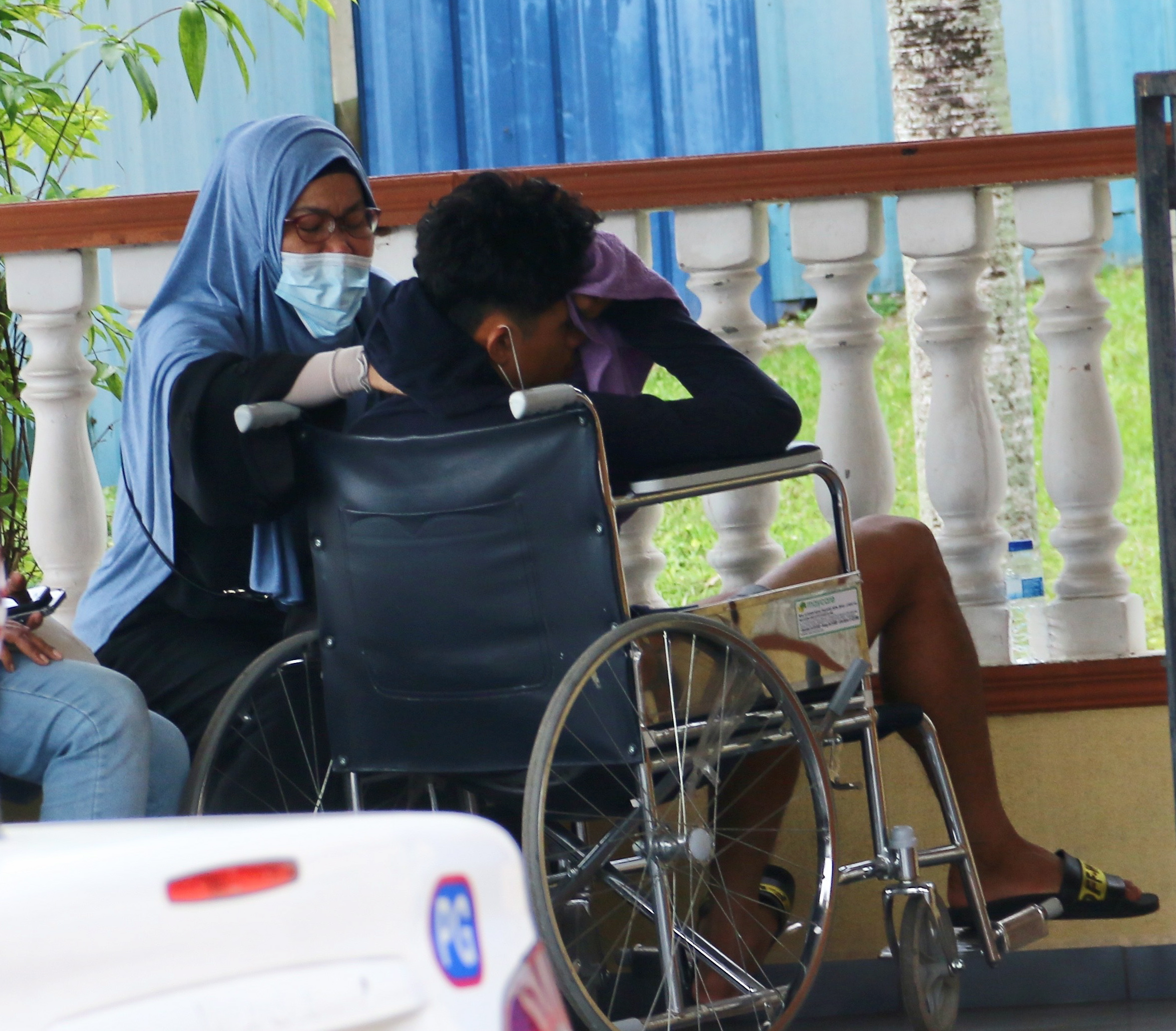 Di pekarangan unit forensik hospital berkenaan, Muhammad Syafiq cuba ditenangkan ahli keluarganya susulan kejadian tersebut. – UTUSAN ONLINE