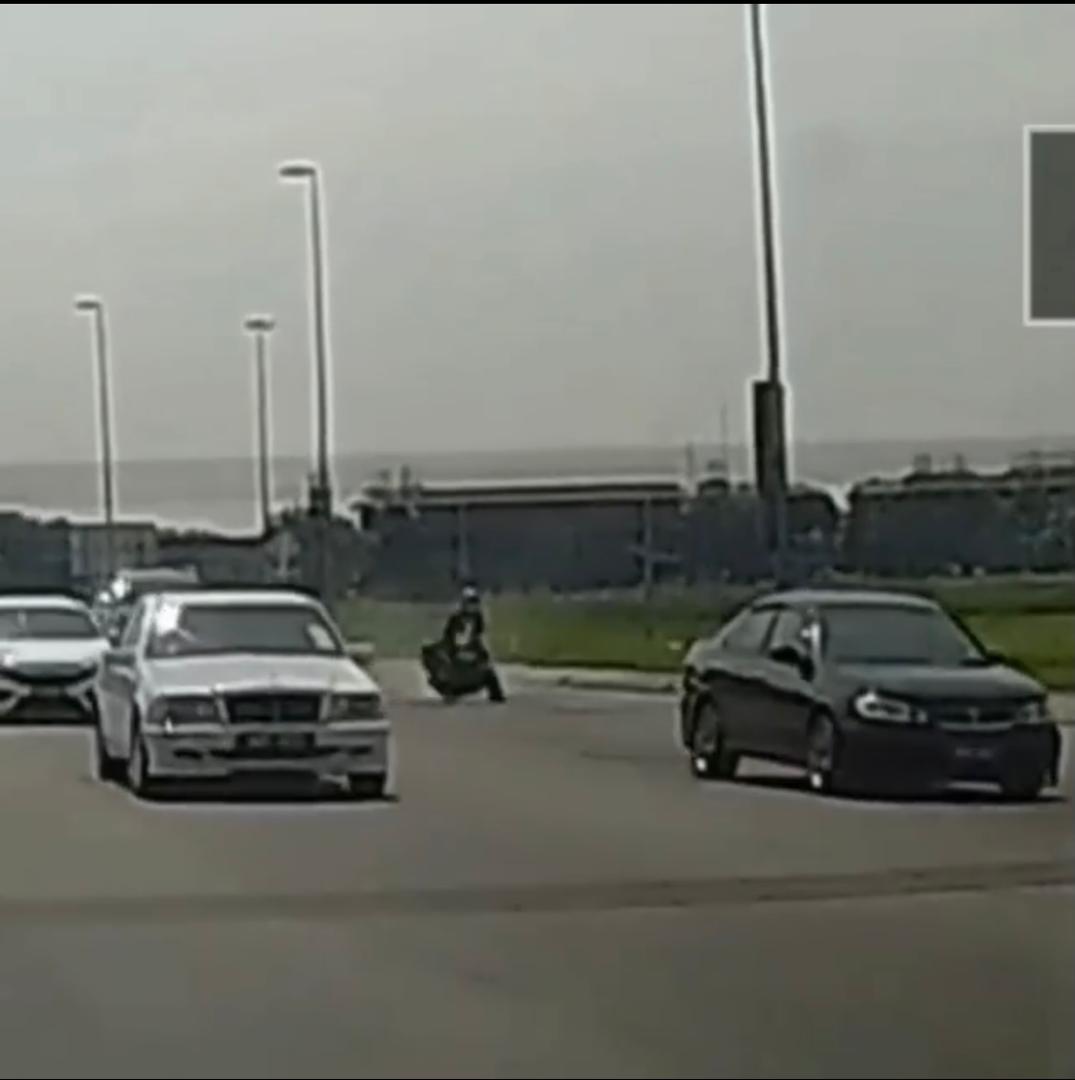 Rakaman itu memaparkan lelaki terbabit cuba menyeimbangkan motosikalnya selepas melanggar lubang tersebut, namun gagal berbuat demikian.