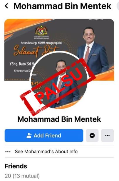 Pautan akaun palsu itu ujarnya ialah https://www.facebook.com/mohammad.binmentek1 manakala pautan akaun sebenar ialah https://www.facebook.com/mohammad.binmentek.