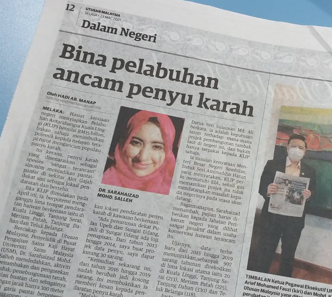 Jika KLIP dimulakan pada April ini, ia berpotensi mengganggu lima tempat pendaratan haiwan berkenaan iaitu di Kuala Linggi, Tanjung Serai, Meriam Patah, Tanjung Dahan dan Teluk Belanga. – UTUSAN ONLINE