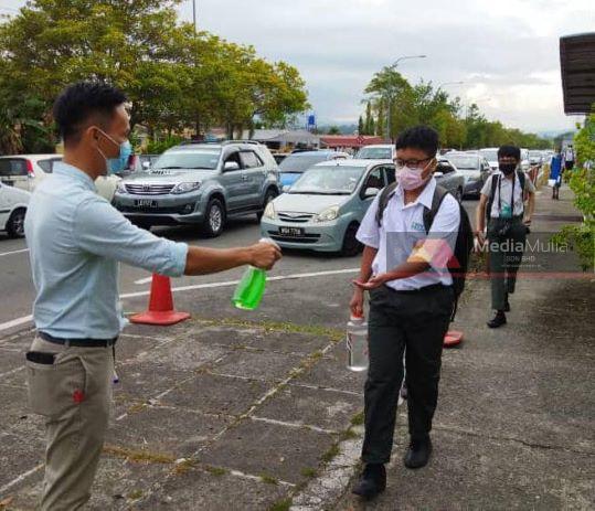 Terdapat seorang guru yang bertugas memberikan pensanitasi tangan kepada setiap pelajar di luar kawasan sekolah dan semua pelajar juga dilihat memakai pelitup muka dan mematuhi penjarakan fizikal ketika menjalani pemeriksaan suhu badan.