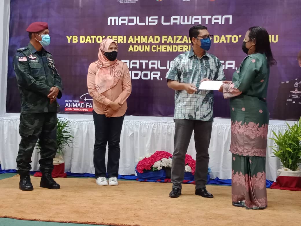 Pada majlis tersebut, Ahmad Faizal yang juga Ahli Dewan Undangan Negeri (ADUN) Chenderiang menyampaikan sumbangan kepada dua wira negara iaitu Sarjan Norihan Tari dan mendiang Sarjan Baharuddin Ramli yang diterima balunya, Relow Ko.