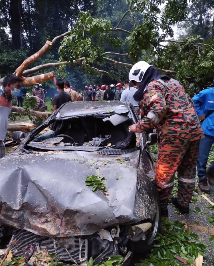 “Pasukan penyelamat tiba enam minit kemudian dan mendapati terdapat dua buah kereta dihempap sebatang pokok besar. Tiga mangsa, iaitu seorang wanita serta dua anaknya terperangkap di dalam kenderaan Proton Wira manakala seorang lagi lelaki di dalam kereta Honda Accord.