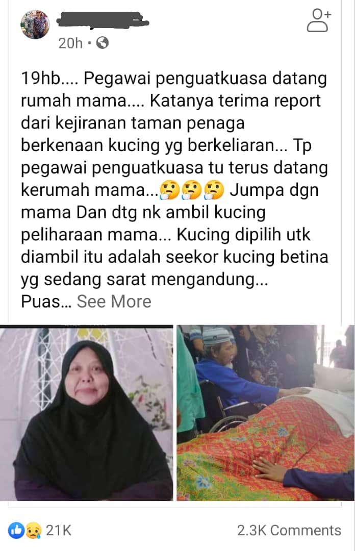 Itu penjelasan pemilik akaun Facebook, Azliya Alia yang juga anak kepada seorang pemilik kucing yang meninggal dunia akibat serangan jantung sehari selepas kucing yang dibelanya diambil oleh penguat kuasa Majlis Bandaraya Seberang Perai (MBSP) pada 19 Mei lalu.