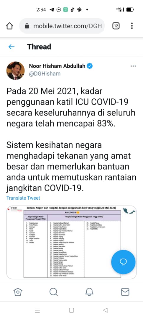 Dalam ciapan sebelum itu, Noor Hisham menjelaskan situasi semasa daerah-daerah di Malaysia hanya tujuh daerah zon kuning manakala tiada lagi zon hijau di Semenanjung berdasarkan pergerakan 14 hari taburan kes Covid-19 setakat 19 Mei 2021