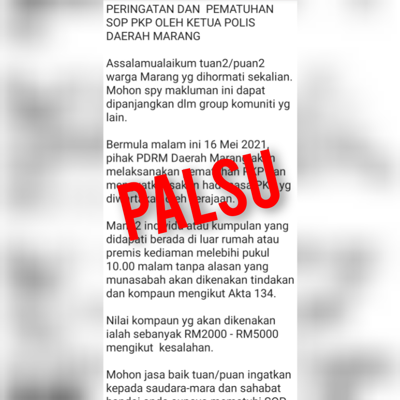 MARANG: Peringatan dan pematuhan prosedur operasi standard (SOP) Perintah Kawalan Pergerakan (PKP) oleh Ketua Polis Daerah ini yang tular di aplikasi WhatsApp sejak semalam disahkan palsu.