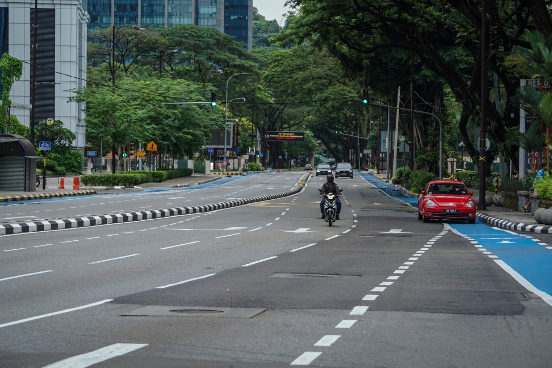 LENGANG…Suasana jalan utama di Jalan Ampang kelihatan lengang pada hari kedua Aidilfitri susulan penguatkuasaan Perintah Kawalan Pergerakan (PKP) 3.0 sehingga 7 Jun ini.