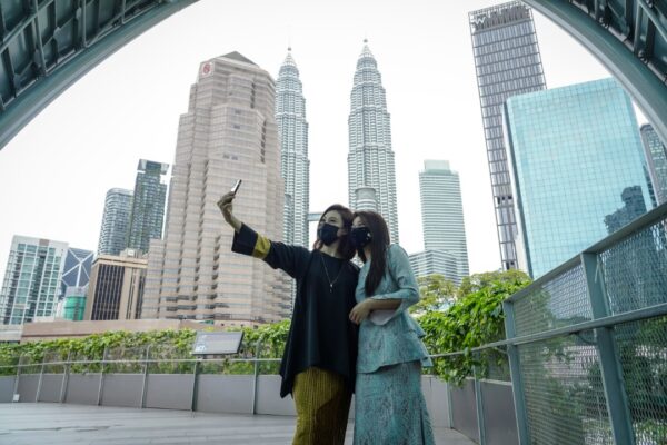Beberapa keluarga turut berpakaian hari raya dan bergambar di depan Bangunan Sultan Abdul Samad dan Pintasan Saloma.