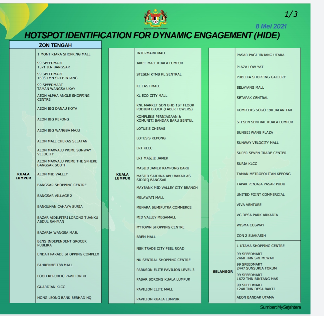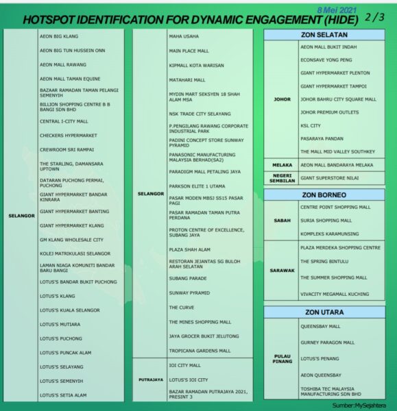 PUTRAJAYA: Hampir kesemua pusat beli-belah di seluruh negara berisiko menjadi lokasi titik panas penularan Covid-19 sekali gus mewujudkan kluster baharu susulan analisis sistem amaran awal Hotspot Identification for Dynamic Engagement (HIDE) untuk tempoh tujuh hari.
