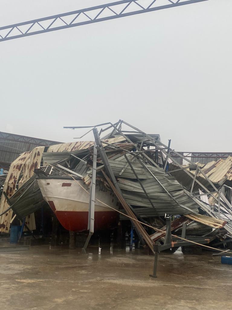 BOT ronda Maritim Malaysia yang sedang dibaiki turut rosak akibat dihempap besi dan struktur bumbung akibat angin kencang di Pejabat Zon Maritim Tanjung Sedili, Kota Tinggi di Johor.