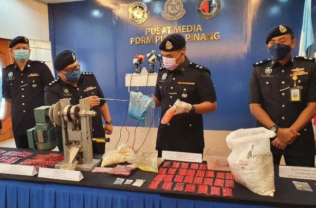 Dalam serbuan itu, polis turut membongkar sebuah makmal memproses pil ekstasi di sebuah rumah teres tiga tingkat di Bukit Gambir, Gelugor dekat sini dan menahan seorang wanita warga China berusia 32 tahun.