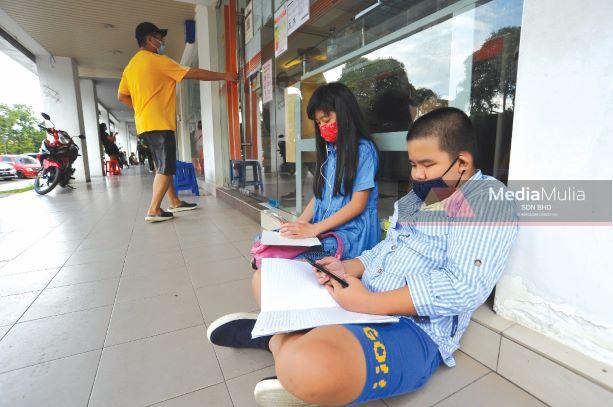 JOHOR BAHRU : Tanpa mengambil kisah orang ramai yang lalu lalang, dua beradik, Mohammad Hong June Hit, 13, dan adiknya, Zaskia Hong Xin Yi, 11, tekun mengikuti sesi Pengajaran dan Pembelajaran di Rumah (PdPR).
