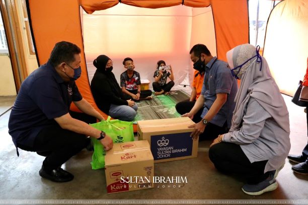 Bantuan sumbangan makanan daripada Sultan Ibrahim disampaikan kepada keluarga-keluarga yang ditempatkan di PPS berkenan yang turut dihadiri Setiausaha Kerajaan Negeri Johor, Datuk Azmi Rohani.