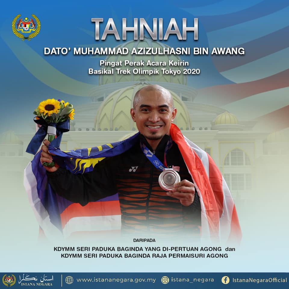 Istana Negara dalam satu hantaran Facebook memaklumkan, Seri Paduka Baginda berdua turut menzahirkan rasa sukacita dan bangga diatas kejayaan Muhammad Aziziulhasni membawa pulang pingat perak buat kontinjen negara di kejohanan sukan terbesar dunia, sekali gus melakar sejarah buat sukan lumba basikal trek negara dan mengharumkan nama Malaysia di persada dunia.