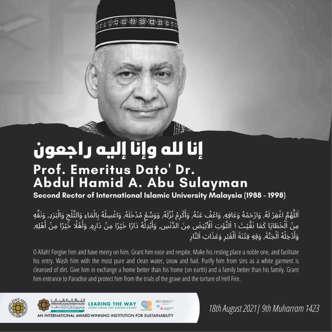 PETALING JAYA: Bekas Rektor Universiti Islam Antarabangsa Malaysia (UIAM) Prof. Emeritus Datuk Dr. Abdul Hamid A. Abu Sulayman, 85, meninggal dunia semalam di Hospital Riyadh, Arab Saudi.