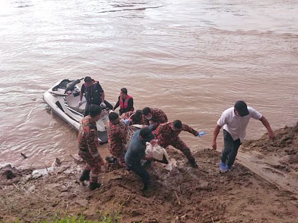 TENOM: Mangsa kanak-kanak bot karam yang dihanyutkan arus di Kampung Kalandos, Pangi semalam ditemukan lemas di Sungai Padas berhampiran Batu 60, Beaufort petang tadi.