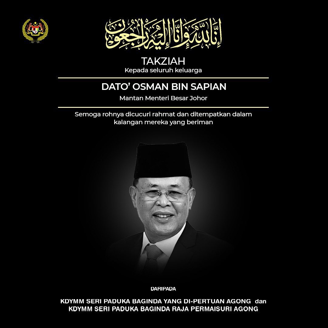 PETALING JAYA: Yang di-Pertuan Agong, Al-Sultan Abdullah Ri’ayatuddin Al-Mustafa Billah Shah dan Raja Permaisuri Agong, Tunku Azizah Aminah Maimunah menzahirkan ucapan takziah kepada seluruh keluarga bekas Menteri Besar Johor, Datuk Osman Sapian yang telah kembali ke Rahmatullah, semalam.