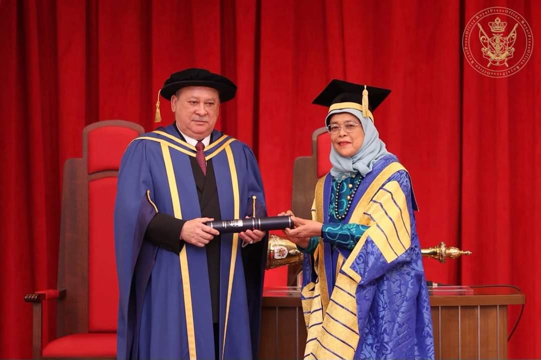 Majlis penganugerahan disempurnakan oleh Presiden Singapura, Halimah Yacob yang juga Canselor NUS sebagai mengiktiraf sumbangan baginda terhadap hubungan dua hala antara Johor dan Singapura.