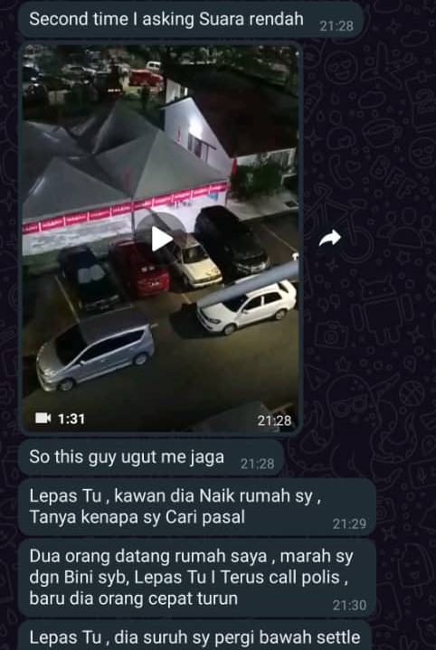 “Selepas saya tegur mereka, dua orang datang ke rumah untuk marah saya dan isteri. Selepas saya cuba untuk menghubungi polis baru mereka beredar. Saya cuma minta mereka perlahankan sedikit pembesar suara.