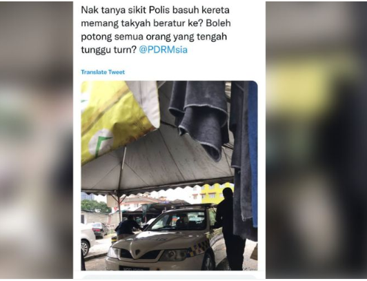 Terdahulu, tular dalam media sosial ciapan berkenaan sebuah kereta peronda memotong barisan ketika di kedai mencuci kereta.