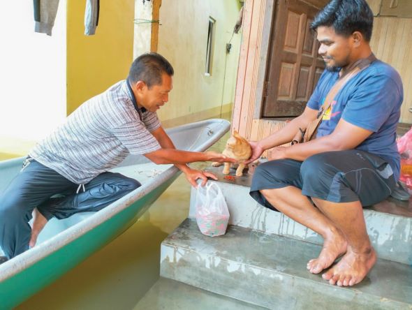PASIR MAS: Seorang lelaki sanggup berulang alik menggunakan bot enjin galah semata-mata mahu memastikan empat ekor kucing peliharaannya tidak kelaparan selepas rumahnya di Kampung Serongga, di sini ditenggelami banjir.