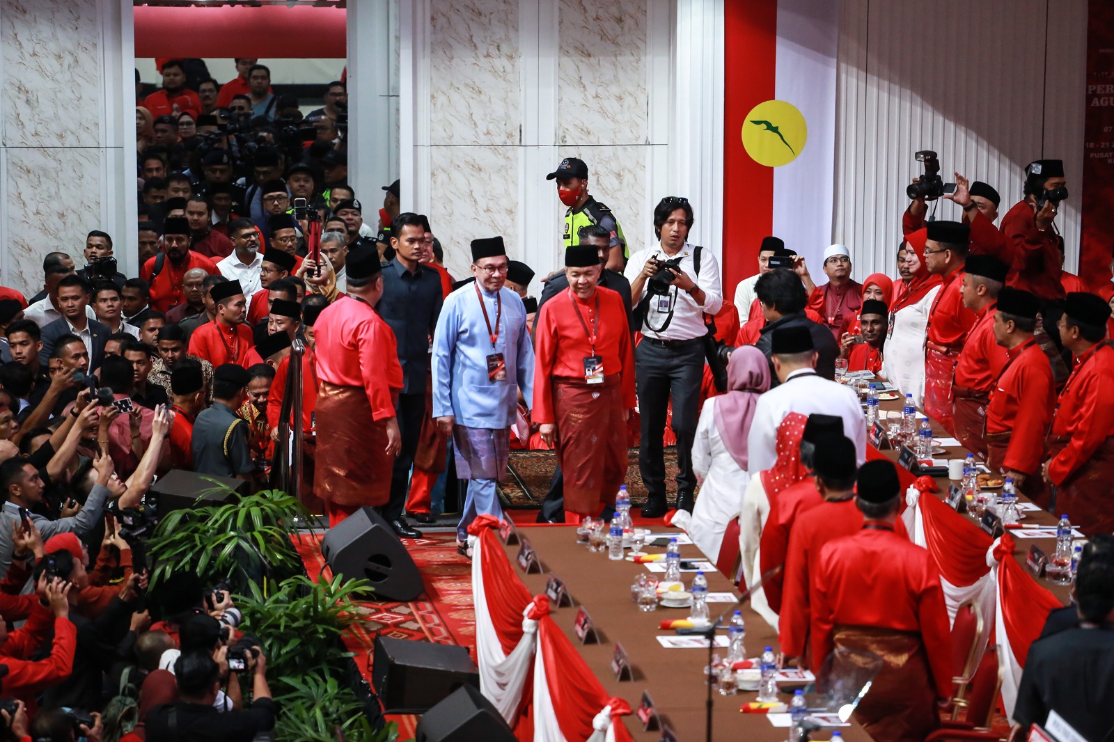 Beliau yang berbaju Melayu berwarna biru muda diiringi Presiden UMNO, Datuk Seri Dr. Ahmad Zahid Hamidi dan timbalannya, Datuk Seri Mohamad Hasan.