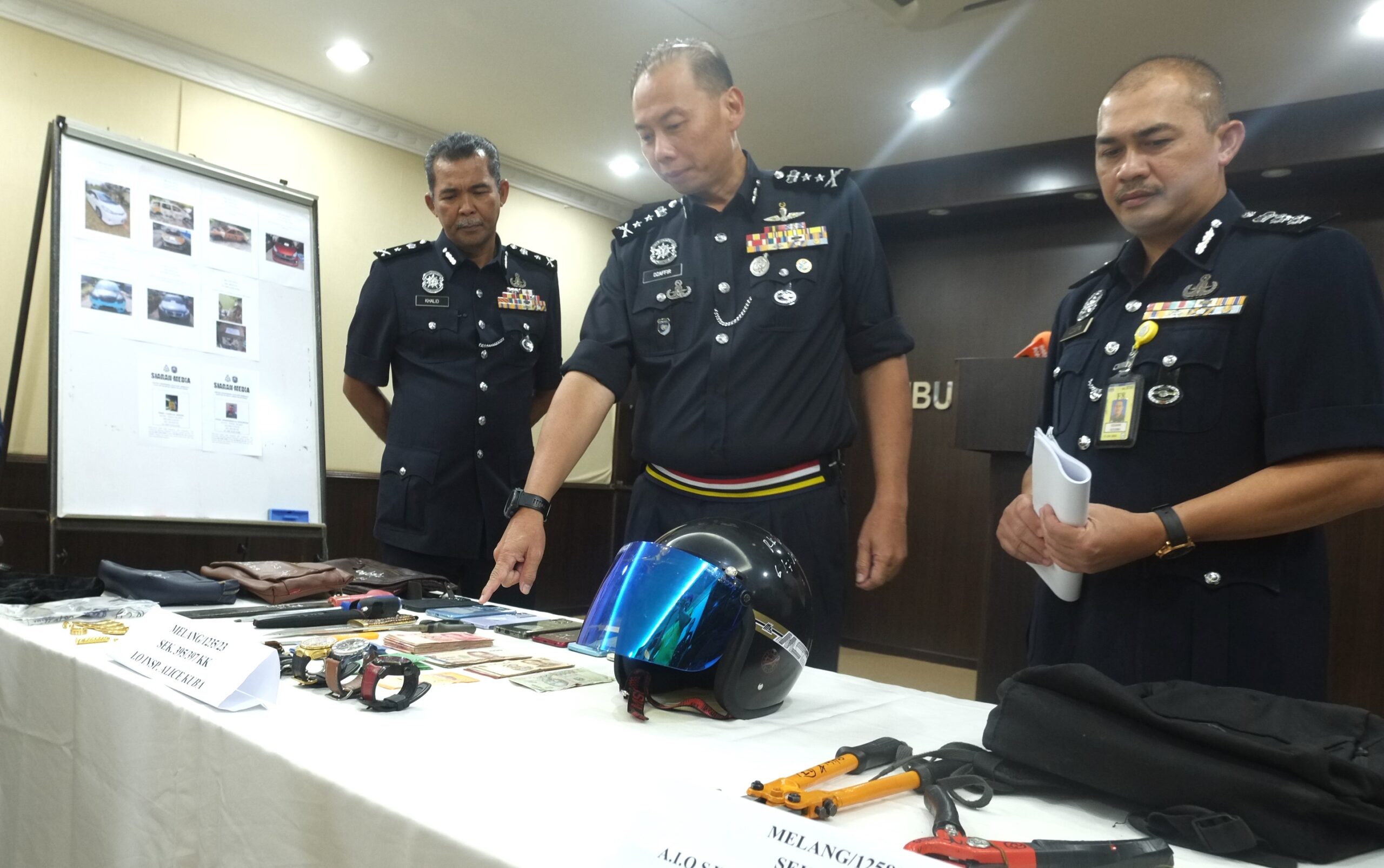 “Antara barang yang dirampas termasuk sebuah kereta Proton Iswara Aeroback, sebuah beg galas warna hitam, pemotong besi, pemotong paip, pemutar skru, dawai besi dan dua anak kunci,” katanya.