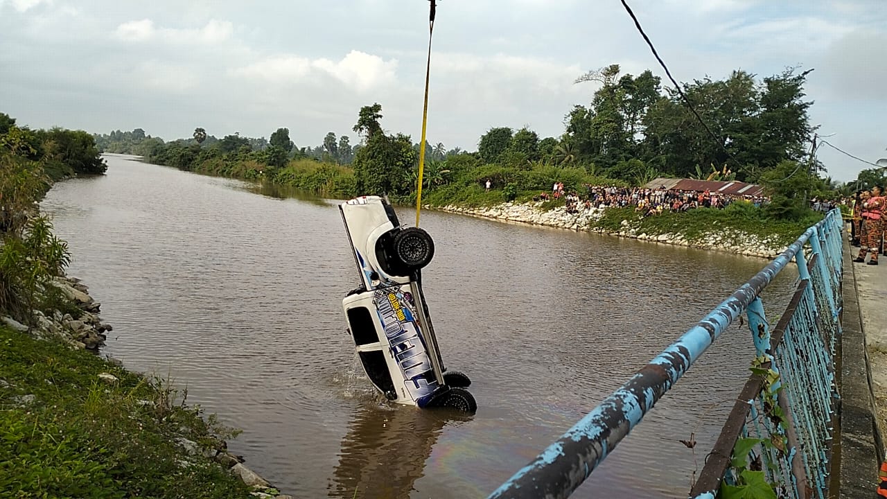Mangsa pertama Eh Bau Eh Di, 43, ditemukan lemas pada pukul 9.20 pagi sejurus kenderaan itu berjaya dinaikan menggunakan bantuan kren.
