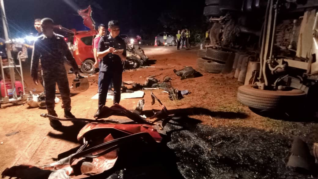SEGAMAT: Lori membawa muatan pasir yang hilang kawalan lalu memasuki laluan bertentangan dipercayai menjadi punca enam sekeluarga terkorban dalam kemalangan di Kilometer 5, Jalan Segamat-Kuantan, petang semalam.