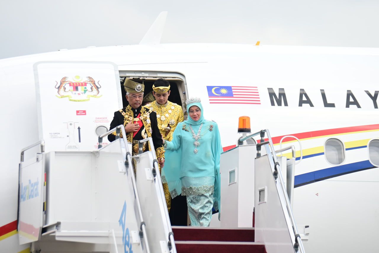 KUANTAN: Yang di-Pertuan Agong, Al-Sultan Abdullah Ri’ayatuddin Al-Mustafa Billah Shah dan Raja Permaisuri Agong, Tunku Azizah Aminah Maimunah Iskandariah selamat tiba di Pangkalan Udara Tentera Udara Diraja Malaysia (TUDM) Kuantan pukul 11.58 pagi ini bagi menyempurnakan Istiadat Keberangkatan Balik baginda berdua.