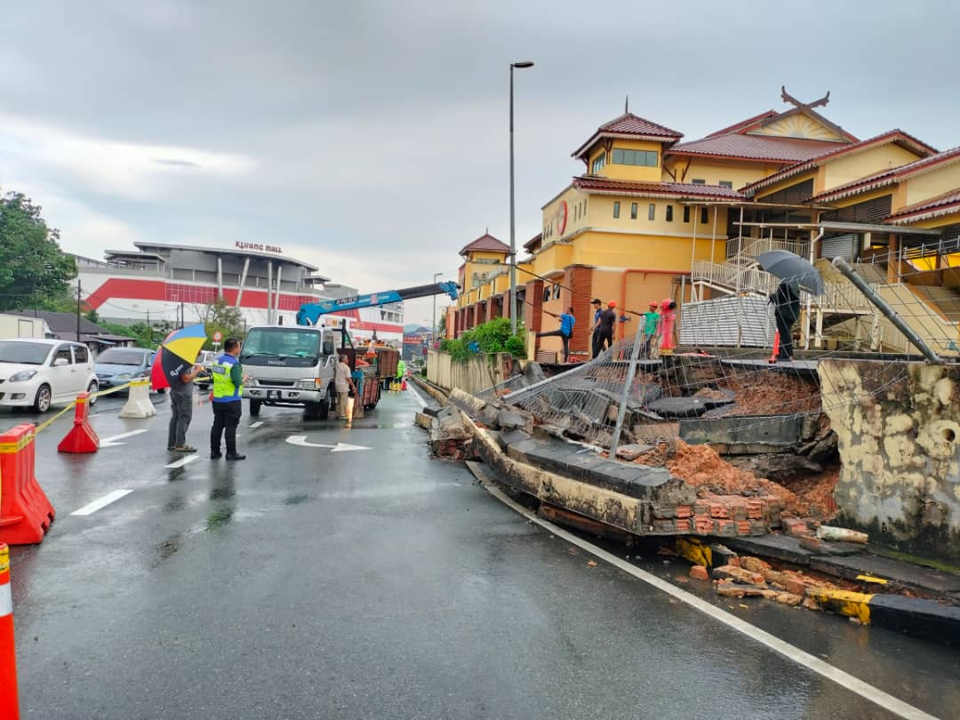 KLUANG: Jalan Rambutan di bandar ini ditutup satu lorong selepas sebahagian kawasan tempat letak kenderaan di Pekan Rabu, runtuh petang ini. Ketua Polis Daerah Kluang, Asisten Komisioner Bahrin Mohd. Noh berkata, penutupan dilakukan bagi membolehkan kerja-kerja menaikkan tebing selain mengalihkan tiang lampu yang dikhuatiri boleh tumbang. Justeru, orang ramai diminta tidak menghampiri kawasan kejadian kerana bimbang berlaku perkara tidak diingini akibat runtuhan itu. “Pemantauan masih dilakukan bagi memastikan tiada runtuhan…