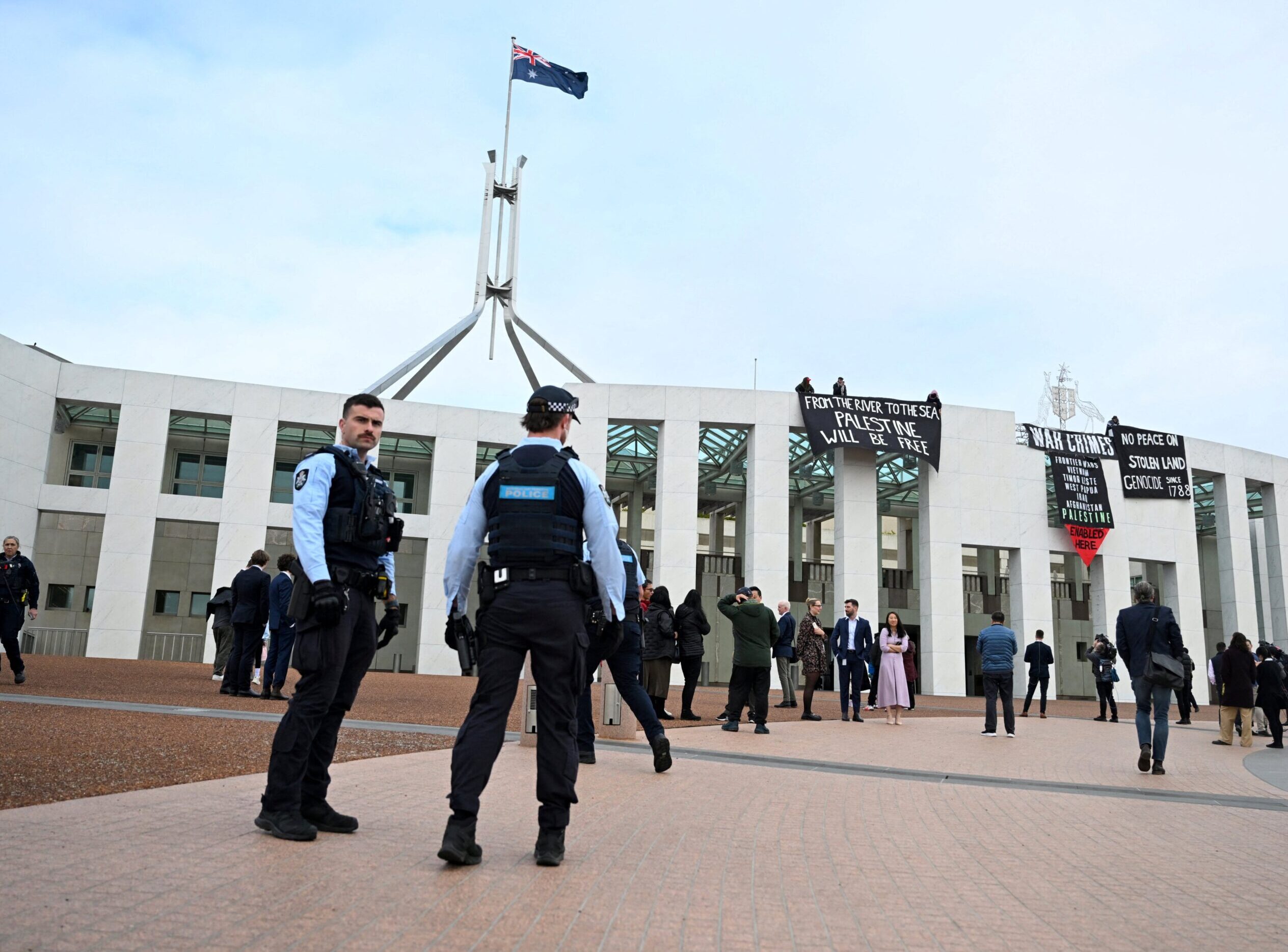 CANBERRA: Penunjuk perasaan pro-Palestin menceroboh bumbung Bangunan Parlimen Australia di Canberra hari ini, dan menggantung sepanduk mengutuk jenayah perang Israel di Gaza serta menyeru pembebasan Palestin. Rakaman televisyen tempatan menunjukkan empat individu berpakaian gelap berada di bumbung bangunan dan menggantung sepanduk hitam bertulis ‘from river to the sea, Palestine will be free‘. Salah seorang penunjuk perasaan juga berucap menggunakan megafon dari atas bangunan tersebut, mengutuk jenayah perang yang dilakukan Israel…