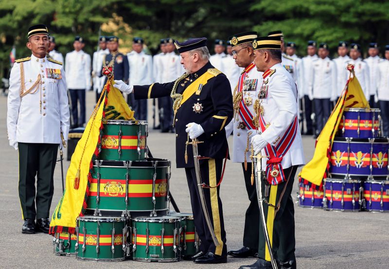 KUALA LUMPUR: Yang di-Pertuan Agong, Sultan Ibrahim berkenan bercemar duli menyempurnakan Istiadat Pertukaran Panji Yang di-Pertuan Agong di Dataran Panglima Tentera Darat, Kem Perdana Sungai Besi di sini, semalam. Istiadat Pertukaran Panji-panji Seri Paduka Baginda itu merupakan kali pertama diadakan sejak pemerintahan Sultan Ibrahim dan kelazimannya ia dilaksanakan oleh Angkatan Tentera Malaysia (ATM) apabila terdapat keperluan penggantian panji-panji yang lama dan lusuh. Sultan Ibrahim hadir bersama anakanda-anakanda baginda iaitu Tunku…