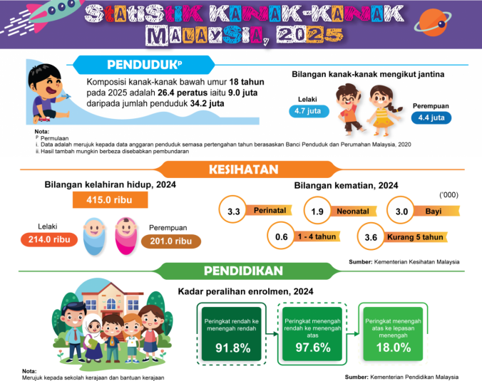 Jelas Mohd Uzir, jumlah kanak-kanak berumur bawah 18 tahun di Malaysia dianggarkan seramai 9.03 juta orang, iaitu 26.4 peratus daripada jumlah penduduk 34.23 juta berdasarkan anggaran penduduk 2025.