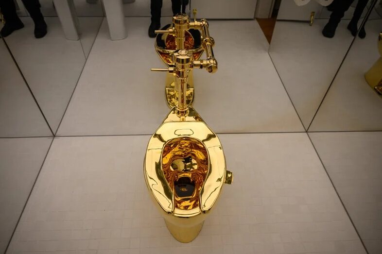 Karya seni berjudul America itu, dihasilkan pada 2016 oleh artis konseptual Maurizio Cattelan, yang membuat dua versi arca tersebut.