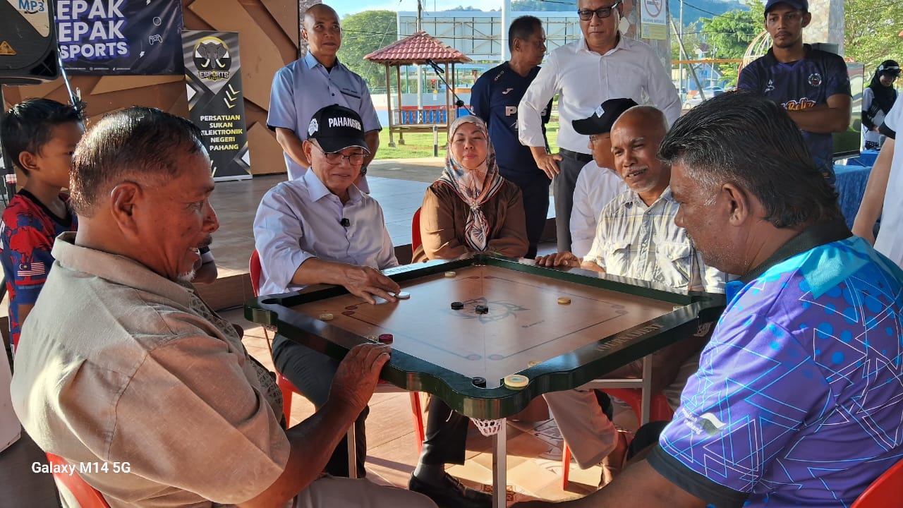 MARAN: Menteri Besar, Datuk Seri Wan Rosdy Wan Ismail mencuri perhatian apabila mempamerkan kemahiran bermain karom dalam perlawanan santai bersama penduduk di Laman Qulbu di sini.