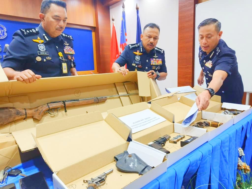 Dalam serbuan pukul 5 petang itu, polis turut merampas dua pucuk pistol tiruan, 27 biji serbuk kaliber, kelopak peluru (2), sebuah motosikal dan telefon bimbit (3).