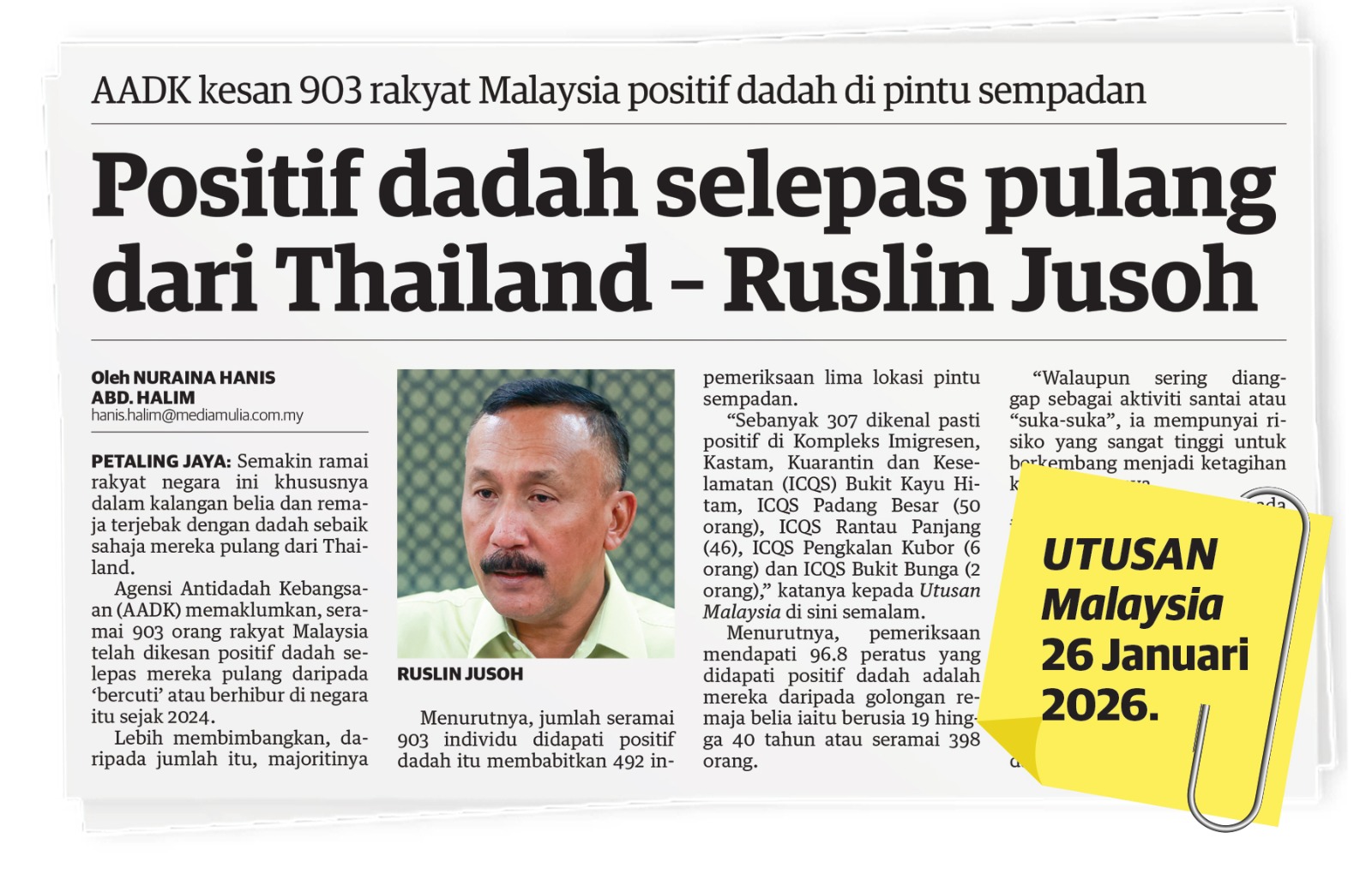 PETALING JAYA: Kebanyakan rakyat Malaysia yang berhibur di negara Thailand dikesan mengambil dadah jenis methamphetamine atau yang dipanggil syabu, ‘ais’, ‘sejuk’ dan ‘batu’ oleh penagih dadah. Ketua Pengarah Agensi Antidadah Kebangsaan (AADK), Datuk Ruslin Jusoh berkata, jumlah itu berdasarkan daripada 411 orang yang didapati positif dadah selepas pulang dari Thailand tahun lalu. Katanya, daripada jumlah itu, seramai 135 individu dikenal pasti positif dadah methamphetamine; ketamin (108 orang), ganja (74 orang)…