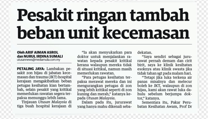 KUALA LUMPUR: Peningkatan jumlah pesakit kategori hijau di Jabatan Kecemasan hospital kerajaan terus menjadi perhatian apabila hasil tinjauan mendapati faktor kos dan akses rawatan menjadi sebab utama orang ramai sanggup menunggu lama untuk mendapatkan rawatan. Tinjauan Utusan Malaysia di tiga buah hospital kerajaan di Lembah Klang mendapati, majoriti pesakit kategori hijau terdiri daripada golongan pelajar dan individu berpendapatan rendah yang memilih kemudahan awam atas faktor kos serta kemudahan rawatan yang…