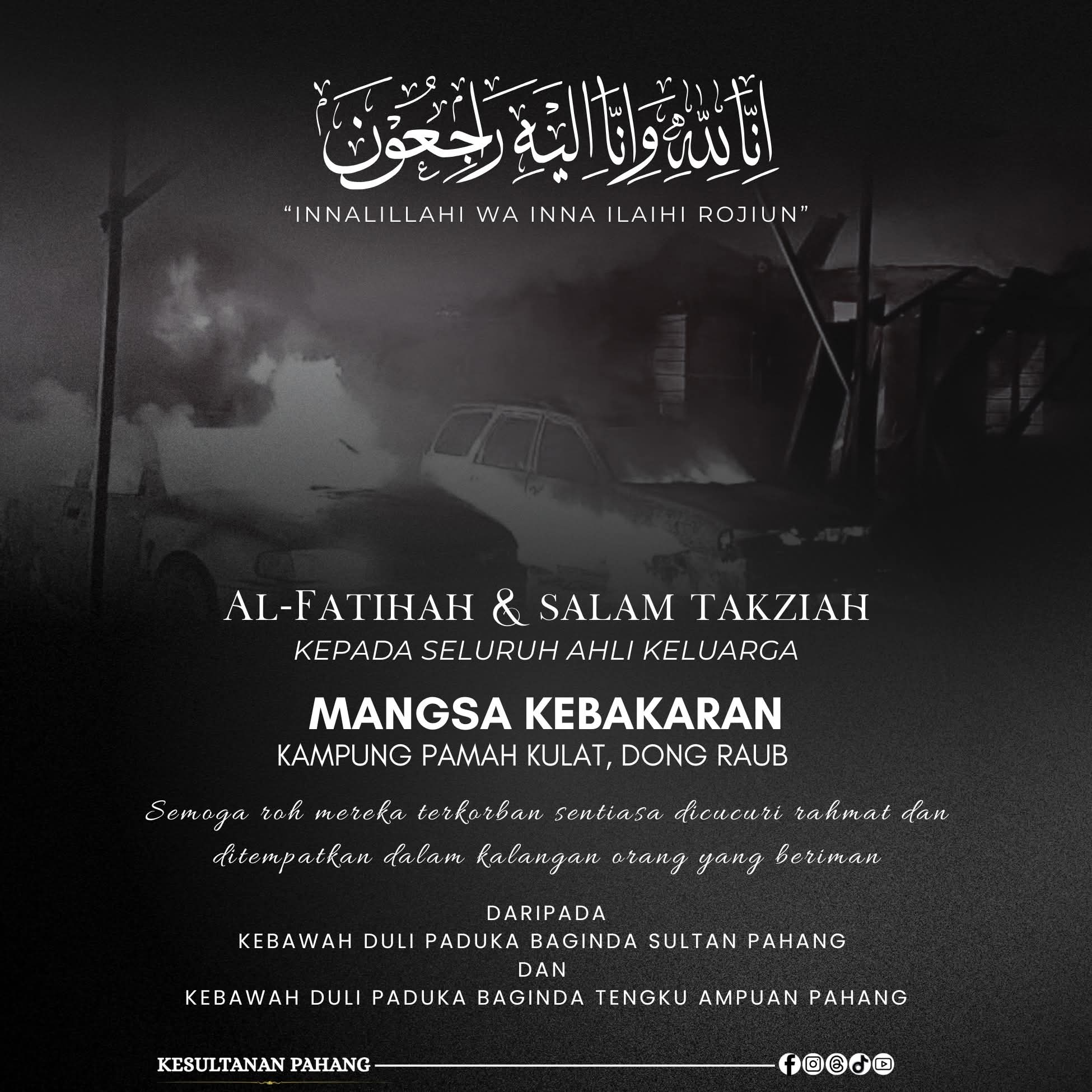 KUANTAN: Sultan Pahang Al-Sultan Abdullah Ri’ayatuddin Al-Mustafa Billah Shah dan Tengku Ampuan Pahang, Tunku Azizah Aminah Maimunah Iskandariah menzahirkan ucapan takziah kepada waris lima sekeluarga yang ditemukan meninggal dunia dalam tragedi kebakaran di Kampung Pamah Kulat, Dong, Raub awal pagi tadi.