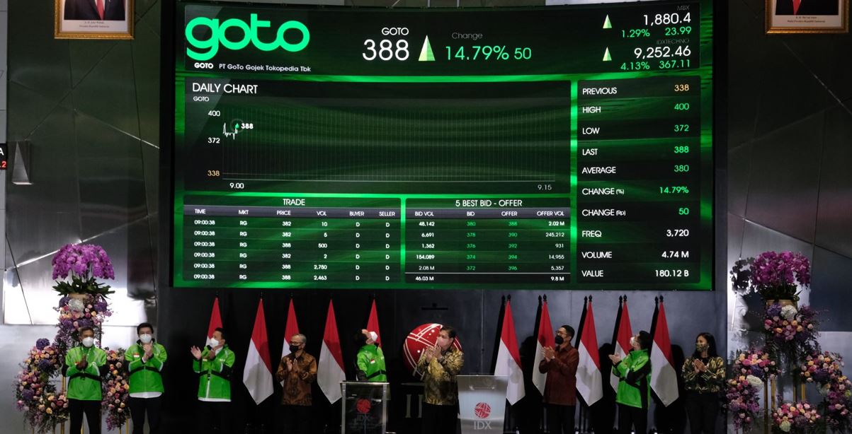 JAKARTA: Saham GoTo melonjak sebanyak 23 peratus dalam penampilan sulung pasaran mereka pada Isnin, selepas syarikat teknologi terbesar Indonesia itu memperoleh AS$1.1 bilion (RM4.65 bilion) dalam tawaran awam permulaan (IPO) yang dijangka secara meluas, menetapkan mod untuk tawaran teknologi lain. Saham GoTo meningkat kepada sebanyak 416 rupiah (AS$0.0290 atau kira-kira 12 sen) berbanding harga tawaran mereka sebanyak 338 rupiah sesaham, yang merupakan tahap tertinggi bagi julat indikatif untuk salah satu…