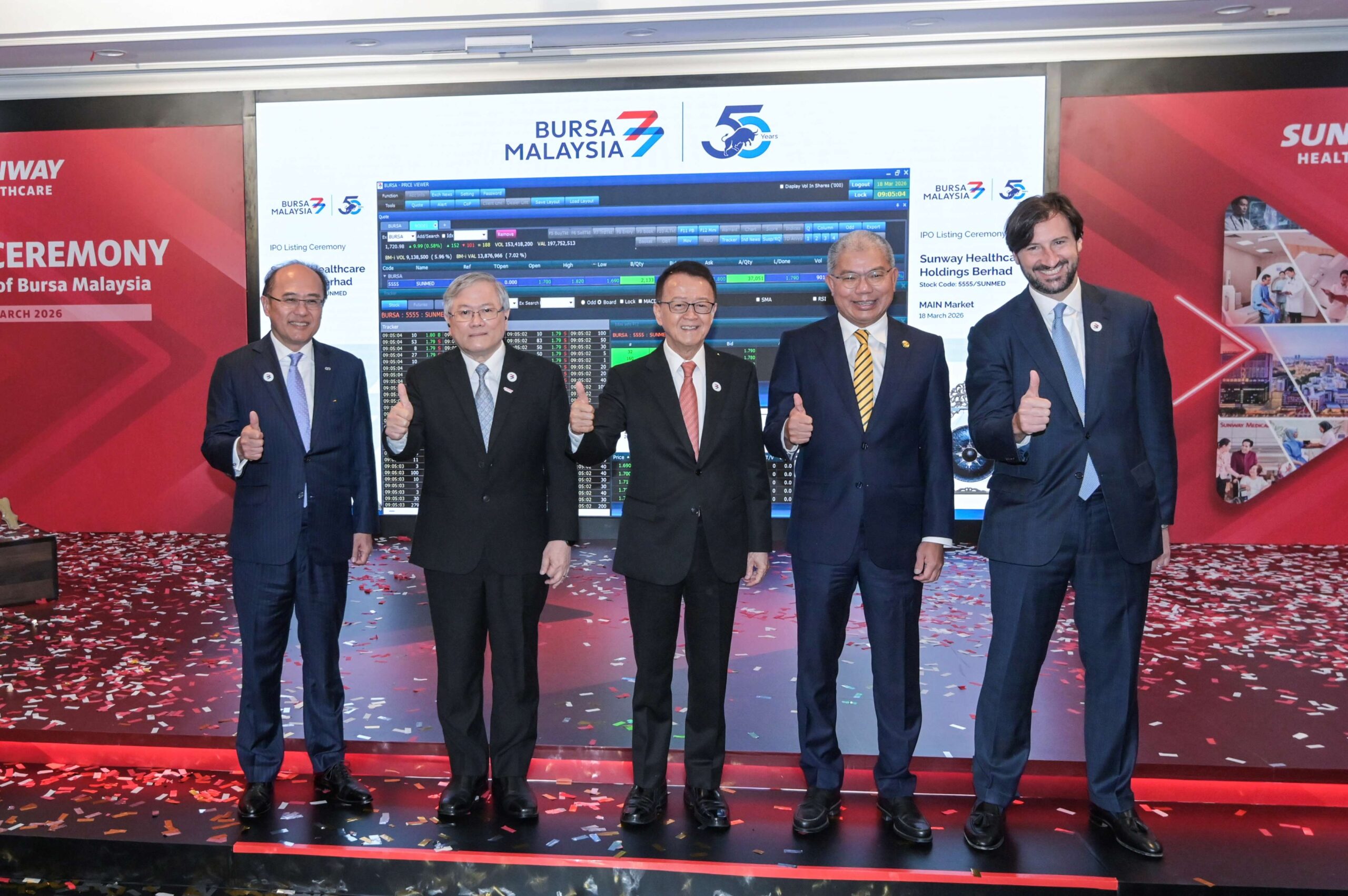 Sunway Healthcare Holdings Bhd membuat penampilan sulung di Pasaran Utama Bursa Malaysia pada RM1.70 sesaham, premium 25 sen berbanding harga tawaran awam permulaan (IPO) IPO RM1.45, dengan 36.2 juta saham diniagakan.