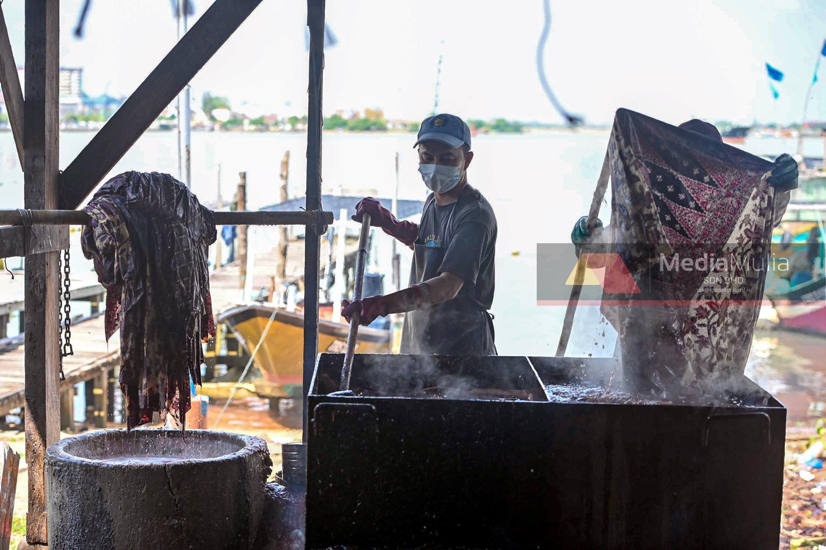 KUALA NERUS 9 Ogos 2022 – Pemilik Wan Azhar Batik, Wan Mohd Hasnor Wan Azhar, 41, (kiri) bersama pekerjanya melakukan proses merendam kain batik di dalam kawah air panas untuk menanggalkan warna tertentu daripada kain batik di bengkel di Kampung Seberang Takir. -UTUSAN/PUQTRA HAIRRYKUALA NERUS 9 Ogos 2022 – Pekerja Wan Azhar Batik, Yazli Mohd Abu Ghani, 47, membilas kain batik yang telah siap untuk dikeringkan diampaian di bengkel di Kampung Seberang Takir. -UTUSAN/PUQTRA HAIRRYKUALA NERUS 9 Ogos 2022 – Pekerja Wan Azhar Batik, Yazli Mohd Abu Ghani, 47, menjemur kain batik untuk dikeringkan di ampaian di bengkel yang terletak di Kampung Seberang Takir. -UTUSAN/PUQTRA HAIRRY