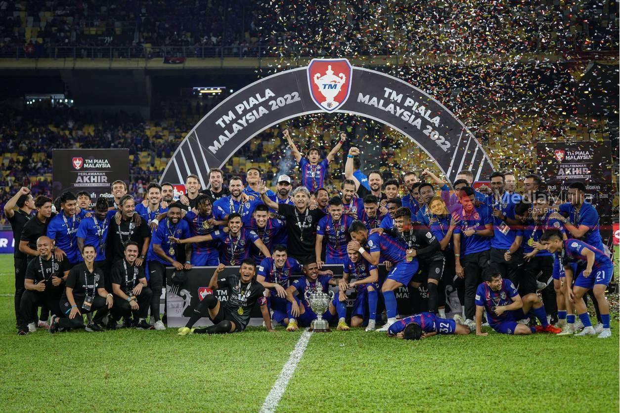 JOHOR BAHRU, 26 November – Para penyokong bersorak gembira sebaik saja jaringan penyamaan oleh penyerang JDT Bergson Da Silva melalui tayangan skrin gergasi di Dataran Bandaraya Johor Bahru pada perlawanan akhir Piala Malaysia menentang Selangor FC. UTUSAN/RAJA JAAFAR ALI