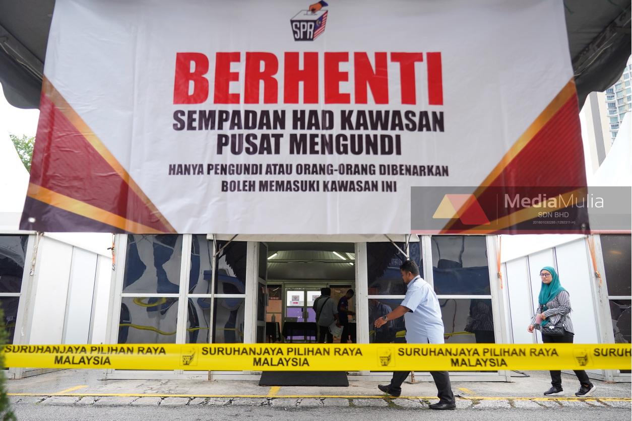 JOHOR BAHRU, 14 November – Petugas SPR meletakkan penghadang sebagai persiapan menghadapi undi awal di Balai Polis Kempas, Taman Putra, Kempas Johor Bahru disini. UTUSAN/RAJA JAAFAR ALI