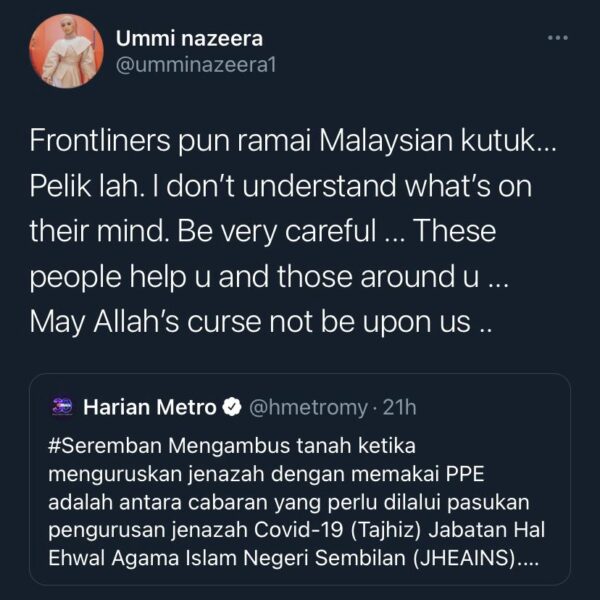 “Berhati-hatilah apabila memberi pendapat, barisan hadapan ini yang menolong anda dan mereka jugalah menolong orang-orang di sekitar anda. Semoga Allah melindungi kita semua,” tulisnya menerusi ciapan di Twitter.