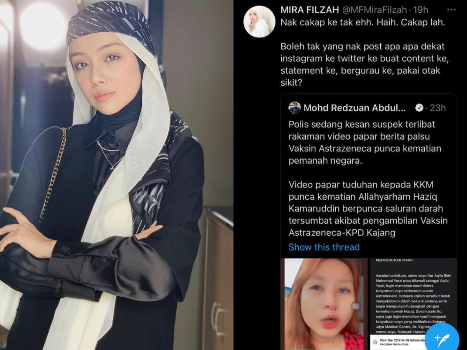 Mira meluahkan rasa kecewanya itu dengan berkongsi semula mengenai dakwaan seorang wanita, Aqila Yusri berhubung kes berita palsu mengenai punca kematian pemanah negara, Allahyarham Haziq Kamaruddin akibat pengambilan vaksin AstraZeneca.